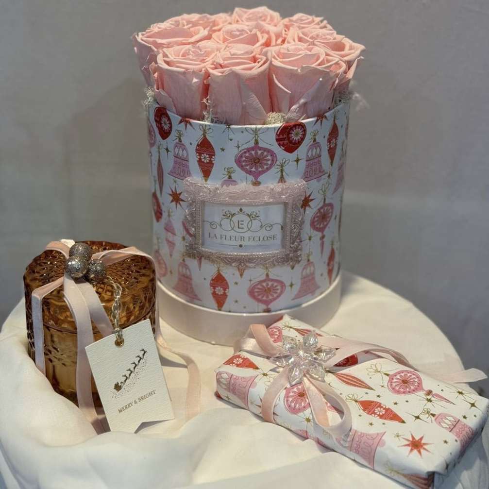 Price: $350.00 Winter Elegance Gift Set — Eternal White Roses, Luxe Candle & Artisan Chocolate Product Tags: Same-day Delivery